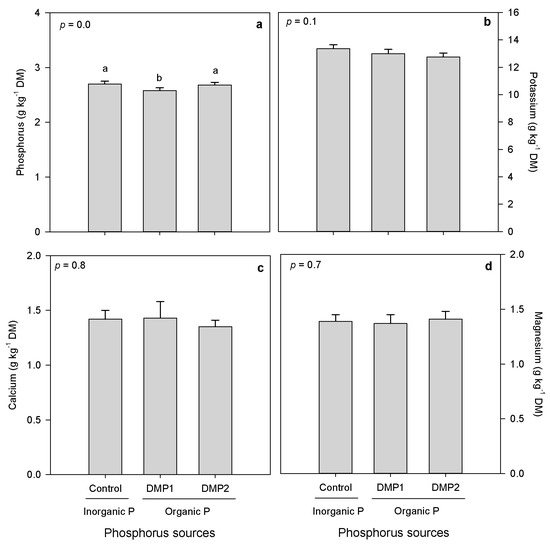 Effects of inorganic and organic phosphorus amendments on forage minerals of silage-corn (a) phosphorus, (b) potassium, (c) calcium and (d) magnesium grown in boreal climate. Each bar represents mean of three replications ± SE.