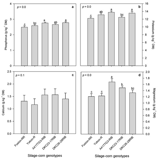 Silage-corn is generally low in Ca (1.4–3.0 g kg−1), whereas K was up to 1.2% on dry weight basis [59]. In the present study, we found Ca ranges between 1.2–1.6 g kg−1 and K between 12–14 g kg−1 among five silage-corn genotypes (Figure 3b). It is interesting to note that under our three-year field experiment, all five-tested silage-corn genotypes expressed slightly higher or similar range of P, Ca and K and were consistent with reports in the literature [30,60,61]. A4177G3-RIB genotype exhibited superior forage quality indices and produced significantly higher P, K and Mg; however, it was statistically on par with DKC26-28-RIB and ranked as high forage quality genotype according to the literature.