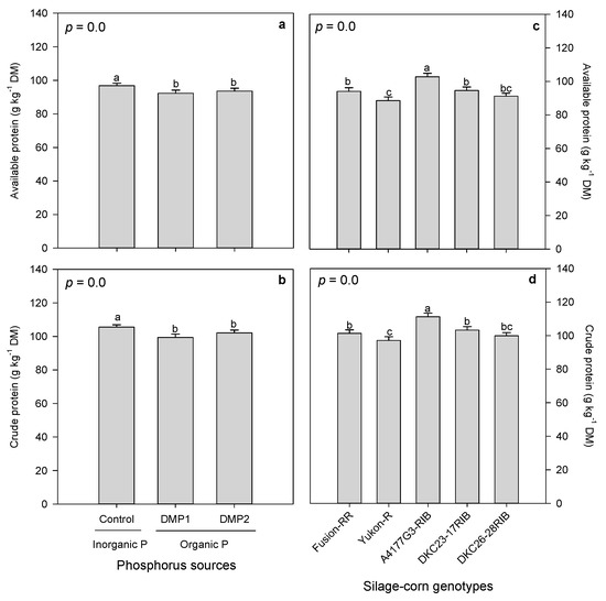 Effects of inorganic and organic phosphorus amendments on forage proteins: (a) available protein and (b) crude protein. Variation in available protein (c) and crude protein (d) among silage-corn genotypes. Each bar represents mean of three replications ± SE.