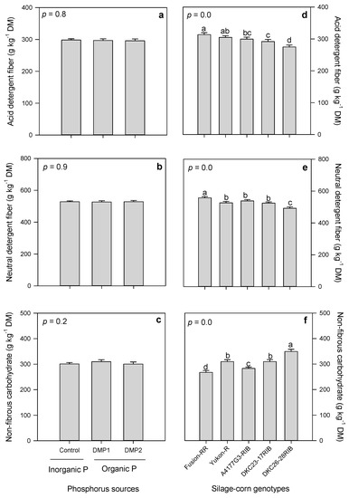 Effects of inorganic and organic phosphorus amendments on forage fibers: (a) acid detergent fiber (ADF), (b) neutral detergent fiber (NDF), and (c) non-fibrous carbohydrates (NFC). Variation in ADF (d), NDF (e), and NFC (f) among silage-corn genotypes. Each bar represents mean of three replications ± SE.