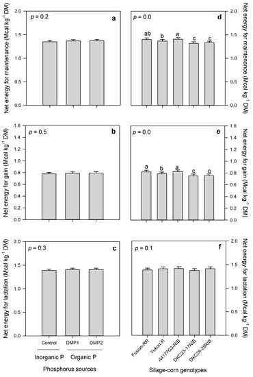 Effects of inorganic and organic phosphorus amendments on forage energies: NEM (a), NEG (b), and NEL (c). Variations in NEM (d), NEG (e), NEL (f) among silage-corn genotypes grown in boreal climate. Each bar represents mean of three replications ± SE.