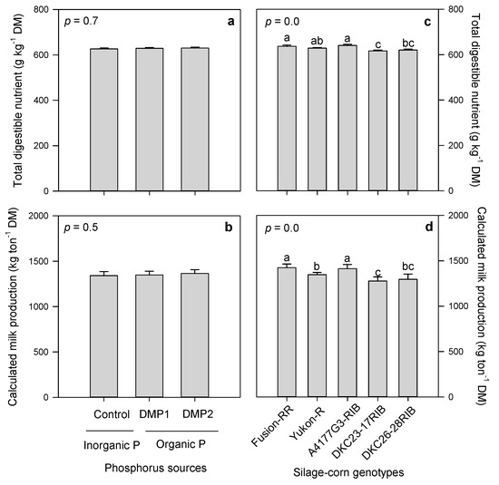 Effects of inorganic and organic phosphorus amendments on forage total digestible nutrients (a) and calculated milk production (b). Variations in total digestible nutrients (c) and calculated milk production (d) among silage-corn genotypes grown in boreal climate. Each bar represents mean of three replications ± SE.