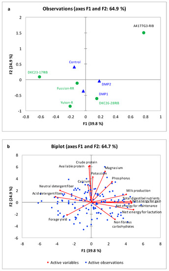 Principal component analysis (PCA) observation plot (a) and biplot (b) of the first two components performed on the forage yield and forage quality of five silage-corn genotypes affected by organic (DMP1 and DMP2) and inorganic P amendments. Centroids showing segregation of silage corn genotypes and P amendments on axis F1 and F2 based on forage production and forage quality.