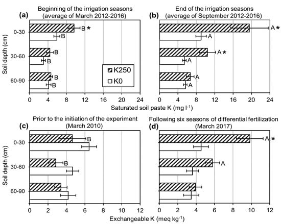 Analysis of saturated soil paste extract enables estimation of K immediately available for uptake by plant roots []. Thus, the lower levels of soil saturated paste K content in the plots receiving no K fertilizer indicated reduced availability of K to the trees. In both fertilization regimes and all depths, soil solution K levels were significantly higher at the end of the irrigation seasons compared to the beginning of the seasons (Figure 1a,b). As this is also true for plots where K fertilization was omitted, the higher levels at the end of the irrigation seasons cannot be attributed exclusively to the K fertilization. Possibly, the lower K levels following winter (at spring) were the result of K leaching by winter precipitation. Erel et al. [] observed a similar trend in a long-term experiment evaluating the effect of reclaimed wastewater on soil properties. Moreover, the higher K levels at the end of the irrigation seasons in the K0 treatment may be due to K originating in the irrigation water (19 kg K ha−1 season−1).