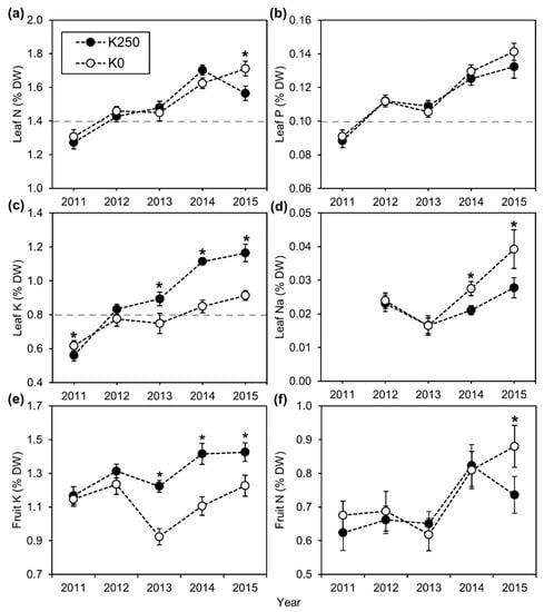 Influence of K fertilization on leaf and fruit mineral concentrations. Experimental plots were fertilized either with an annual amount of 250 kg K ha−1 (K250) or without K (K0). Leaf N (a), P (b), K (c), and Na (d) concentrations were determined in diagnostic leaves sampled during July as percentage form dry weight (DW). Fruit K (e) and N (f) concentrations were determined in a sample of fruits at harvest. Numbers are mean values of 14 replicates (trees) ± standard error of the mean (bars). The dashed grey lines show the deficiency-sufficiency threshold for the specific mineral. Asterisks indicate significant statistical difference between K fertilization levels in the specified date according to Student’s t-test (p ≤ 0.05). Values of leaf N for K250 were published previously [].