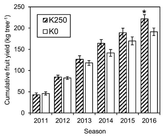 Influence of K fertilization on cumulative fruit yield. Experiment plots were fertilized either with an annual amount of 250 kg K ha−1 (K250) or without K (K0). Cumulative fruit yield per tree over six seasons, from 2011 until 2016. Numbers are mean values of 14 replicates (trees) ± standard error of the mean (bars). Asterisks indicate statistically significant difference between K fertilization levels according to Student’s t-test (p ≤ 0.05).