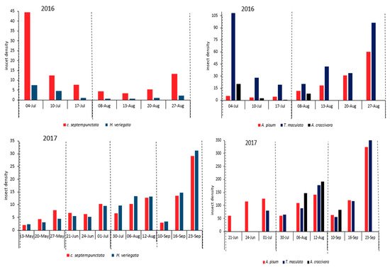 At the beginning of the sampling period in 2016, the T. maculata population was relatively high, but it gradually decreased toward the middle of this period. The sampling period comprises the time interval between the first and last sampling date in each year. The aphid population increased again at the end of season, without evident changes before and after harvests. A. pisum was collected in very low numbers at the beginning of the survey but a slight increase in its population was observed after harvest and this continued until the end of the sampling period. A. craccivora was observed only in the samples taken shortly after the first and second harvests (Figure 1).