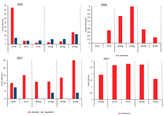 In 2016, A. lineolatus and L. rugulipennis had two population peaks, at the beginning and end of the sampling period. The population of these insects peaked after the first harvest and then decreased considerably through the midseason. The second peak was observed at the end of the growing season and during the flowering period of the alfalfa plants (Figure 2). The temporal dynamics of the plant bugs was different in 2017. L. rugulipennis was present for only three short periods before harvests and A. lineolatus was not observed in the samples during the first week after harvests and its population reached a peak at the end of the season.