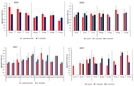 The average of the index of aggregation (Ia) of coccinellids (left) and aphids (right) in 2016 and 2017 (dashed lines indicate alfalfa harvest times). Bars indicate standard errors.