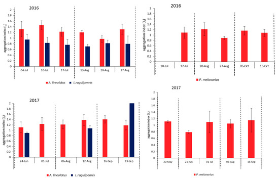 Ia values indicated that the spatial distribution pattern of A. lineolatus and L. rugulipennis was aggregated in 15 out of 35 and 4 out of 26 datasets, respectively (Pa < 0.05). The Ia calculated for the carabid P. melanarius was >1 in 15 out of 30 datasets, which was statistically significant in four cases (Supplementary Tables S2 and S3). The results of SADIE agreed with the results of geo-statistics in 75% of cases. Figure 3 and Figure 4 show the effect of harvests on the SADIE Ia. It seems that only the Ia values of ladybird beetles decreased after the harvest and this event had no significant effect on the aggregation of other species.
