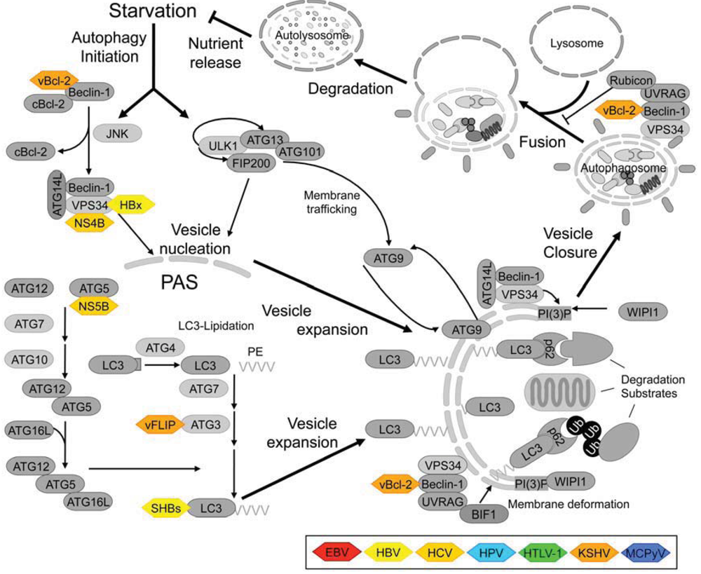 Autophagy is a key homeostatic process conserved across all eukaryotic cells. The term literally translated means “self-eating” and describes a degradation pathway for intracellular structures via the lysosomal compartment. Although several mechanistically distinct forms of autophagy are distinguished (macro-, micro- and chaperone-mediated autophagy (reviewed in [105]) “autophagy” is commonly (and also for the purpose of this review) used synonymously with macroautophagy, the most widely studied subtype. (Macro)autophagy is characterized by formation of large, double membraned vesicles, so called autophagosomes, that sequester bulk portions of cytoplasm and, after closure, fuse with lysosomes so that the cargo can be degraded by lysosomal enzymes. This process takes place at a low basal level under physiologic conditions and facilitates turnover of long-lived proteins and organelles. However, upon exposure to environmental and endogenous stressors, such as nutrient- and growth factor deprivation, hypoxia, high temperature or organelle damage, autophagy is upregulated. Autophagy primarily represents a pro-survival mechanism, but in complex multicellular organisms, it serves additional purposes, including a role in adaptive and innate immunity. Autophagy has also been linked to programmed cell death, however, it is controversial at present whether the phenomenon of autophagic cell death actually exists [106]. Deregulation of autophagy has been implicated in a variety of human diseases including neurodegenerative diseases, cardiac disease, liver disease, myopathies, cancer and bacterial and viral infection [105]. Human tumors associated with the viruses mentioned above represent the interface between cancer and infectious diseases. Thus, autophagy may play an especially multifaceted role in virus-associated malignancies since it has pro- and anti-tumorigenic as well as pro- and anti-viral functions.