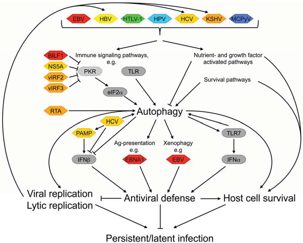 In this review, we summarize our current knowledge on the particular strategies that human tumor viruses have evolved to interface with the host cell autophagy machinery and with autophagy-regulating signaling pathways. We first examine the role of autophagy on the viral life cycle and subsequently describe mechanisms by which tumor viruses modulate this process. Yet, it should be emphasized that most of the virus—host cell interactions discussed below are not specific to human tumor viruses but have been described for non-tumorigenic viruses as well.