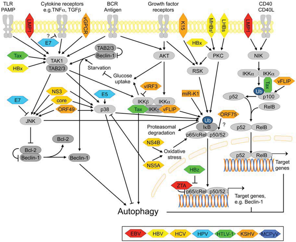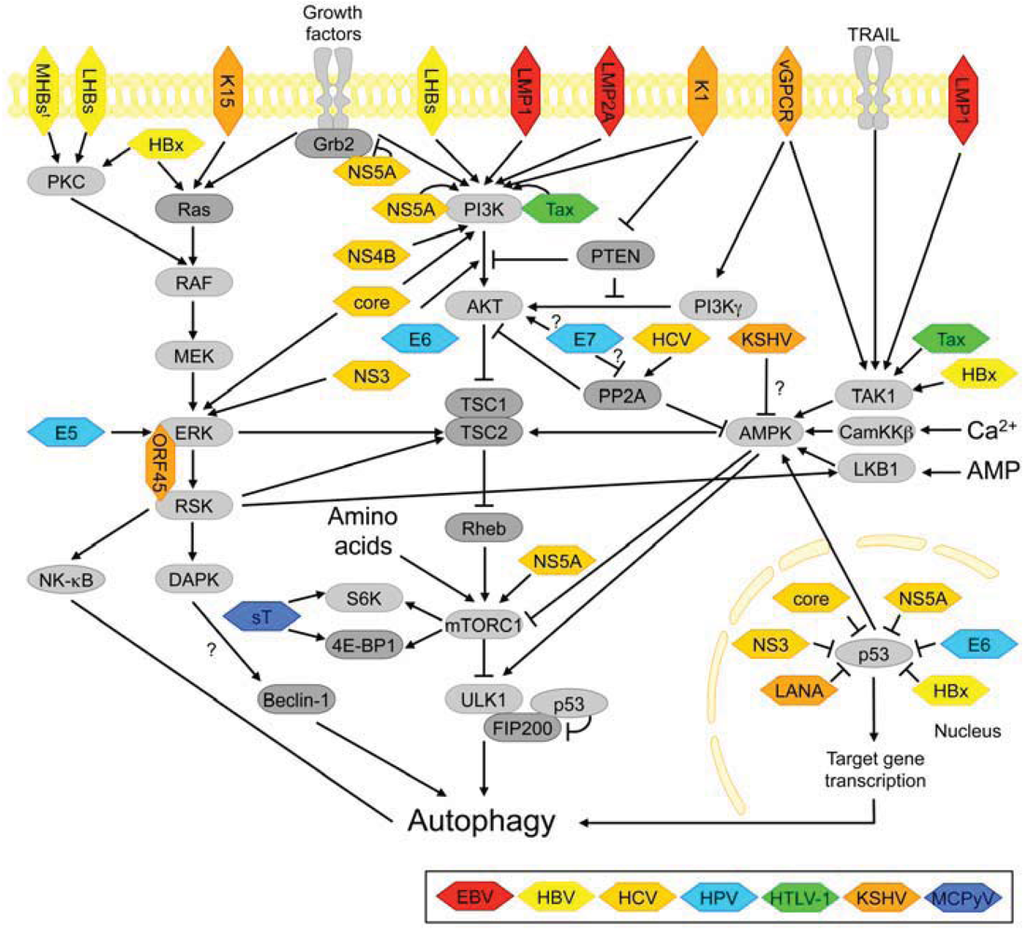 The eight established human tumor viruses interfere with a variety of host cell signaling pathways, including immune signaling pathways and pathways regulating cell growth and survival, often in response to nutrient availability (see Figures 3 and 4). See main text for details. Note: In this figure, and frequently in the literature, the term “autophagy” is used to generally denote biological processes that involve Atg-proteins, even if genuine autophagy (i.e., degradation of intracellular macromolecules/structures) was not formally examined or if the late degradation steps in the pathway appeared to be blocked (for example in several studies on HBV and HCV modulation of autophagy, see main text for details). Light grey rounded rectangles-host cell kinases; dark grey rounded rectangles-other host cell proteins; colored hexagons-viruses/viral proteins.