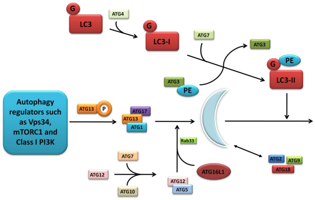 The further detailed and complex molecular machinery involved in autophagosome formation is outwith the scope of this focussed review, however a summary of the major pathways are outlined in Figure 2 and discussed comprehensively in several excellent articles [17,20,21].