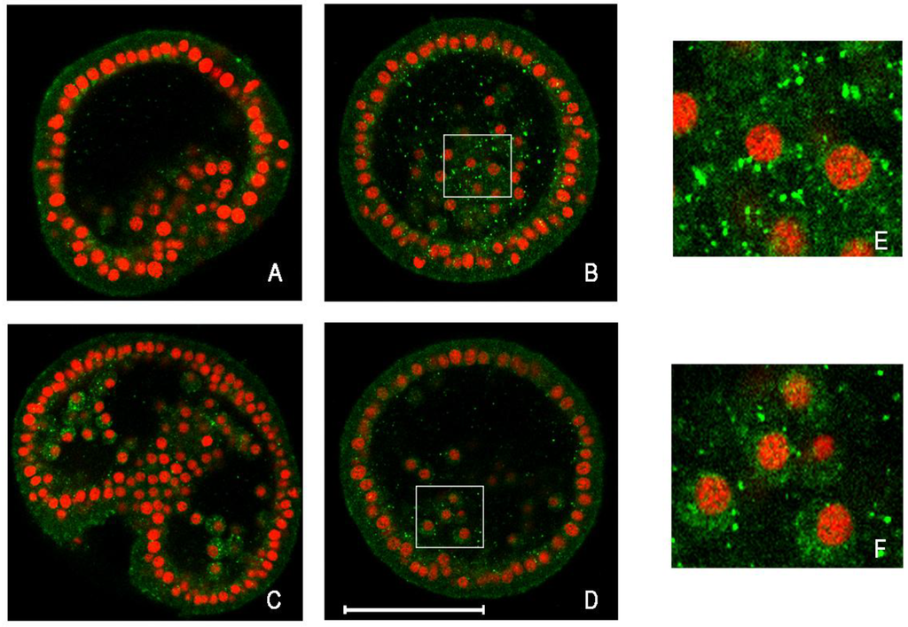 Detection by immunofluorescence of LC3 protein on whole-mount embryos of sea urchin. Equatorial optical sections captured by confocal laser scanning microscopy. In green, LC3 protein detection; in red, nuclei stained with propidium iodide. (A) Control embryo, after 18 h of growth; (B) Cd-treated embryo for 18 h; (C) Control embryo, after 24 h of growth; (D) Cd-treated embryo for 24 h; (E, F) Enlargements of a section of (B, D), respectively. Bar = 50 μm.