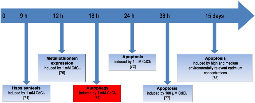 It was previously demonstrated that subacute/sublethal concentrations of Cd induce, during development of sea urchin embryos, morphological abnormalities, activation of specific stress proteins (HSPs), expression of metallothioneins and apoptosis, in a dose/time-dependent manner [75,76]. Essentially, Cd exerts its toxic action in the long term: Embryos accumulate the metal in the cells, as demonstrated by Atomic Absorption Spectrometry. It has been suggested that survival systems adopted during embryonic development of sea urchins can operate in tandem through a putative crosstalk [77,78].