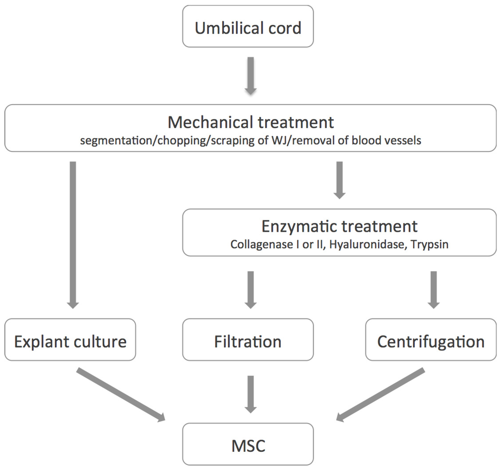 Different techniques used during isolation of mesenchymal stem or stromal cells (MSC) from umbilical cord (UC) tissue. Basically enzymatic digestion or explant culture approaches are used.