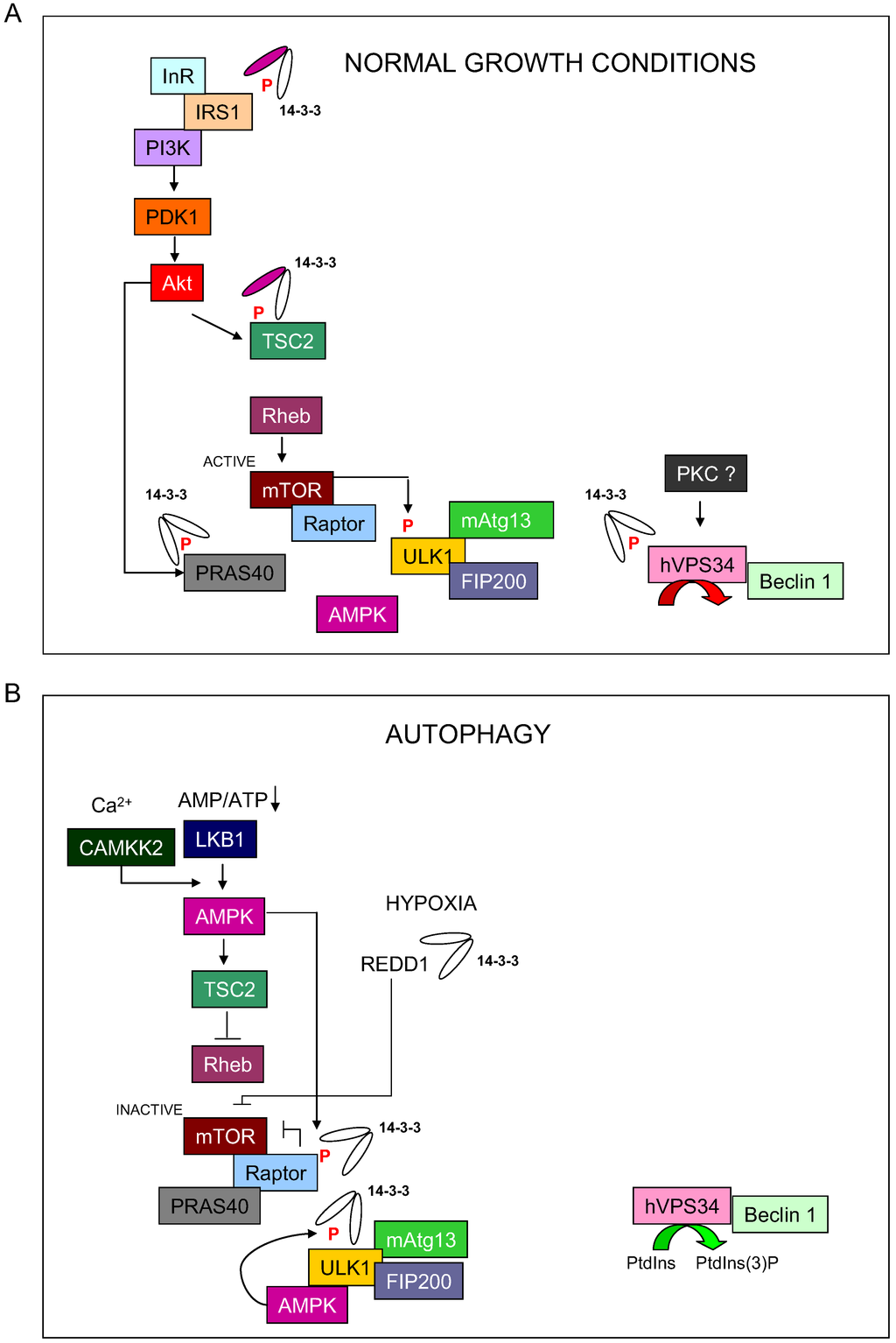 Model of 14-3-3 regulation on autophagy initiation process. (A) During normal growth conditions, 14-3-3 proteins bind and regulate TCS2, PRAS40 and hVps34 to block autophagy. (B) During nutrient starvation, 14-3-3 proteins bind to Raptor and ULK1 to promote the initiation of autophagy.
