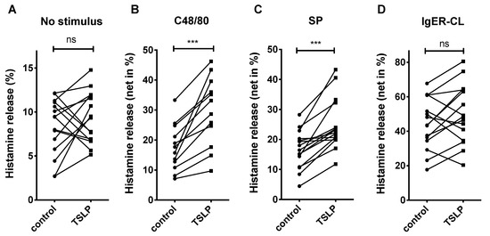 The HRA was performed according to a method routinely employed in our laboratory [5,53]. In brief, MCs in PAG-CM buffer (Piperazine-N,N-bis [2-ethanesulfonic acid]-Albumin-Glucose buffer containing 3 mM CaCl2 and 1.5 mM MgCl2, pH 7.4) were stimulated by FcεRI-aggregation (anti-AER-37 antibody at 0.2 µg/mL eBioscience, San Diego, CA, USA), or c48/80 (Sigma, at 10 µg/mL), or Substance P (SP) (Bachem, Budendorf, Switzerland at 30 µM), or no stimulus (spontaneous) for 30 min at 37 °C. Priming with TSLP (7.5 ng/mL) versus PAG-CM (buffer control) was performed for 30 min before stimulation. Histamine in the supernatants was measured by an automated fluorescence method (Alliance Instruments, Salzburg, Austria). Total cellular histamine content was measured analogously. All determinations were performed in triplicate. Net histamine release (%) was calculated as ((stimulated release–spontaneous release)/complete histamine in the MC preparation) × 100.