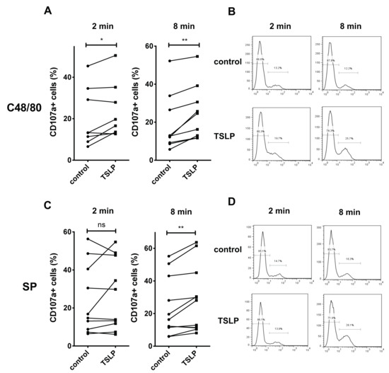 Flow-cytometric detection of CD107a cell surface expression was as described [5,55]. In brief, MCs were pre-stimulated with or without TSLP (7.5 ng/mL) for 30 min, then subjected to 0.2 µg/mL FcεRI-aggregation (anti-AER-37 antibody for 15 min, 30 min, 60 min), 10 µg/mL c48/80 or 30 µM SP (for 2 min and 8 min), or no stimulus (control). The reaction was stopped by ice-cold 4% paraformaldehyde for 15 min. After washing, the cells were incubated with 10 µL of anti-human CD107a-FITC antibody (LAMP-1) (BioLegend, San Diego, CA, USA) together with 10 µL of human AB-serum for 30 min at 4 °C, then washed and CD107a expression was detected by the Facscalibur (BD Biosciences, San Jose, CA, USA).