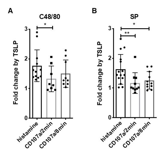 TSLP priming has greater impact on MRGPRX2-elicited histamine release than on CD107a exteriorization. The priming efficiency of TSLP (7.5 ng/mL) was compared between histamine release (according to Figure 1) and CD107a exteriorization (according to Figure 2). (A) c48/80 (10 µg/mL), (B) SP (30 µM). The data are presented as fold change (FC) by TSLP against control. Mean ± SD of n = 8–15 independent experiments. * p < 0.05, ** p < 0.01.