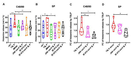 TSLP support of MRGPRX2-triggered degranulation depends on STAT5 and JNK. MCs were pretreated with the JNK inhibitor SP600125 (5 µM), the STAT5 inhibitor Pimozide (5 µM) or no inhibitor (buffer control) for 15 min, then stimulated with TSLP (7.5 ng/mL) for 30 min. (A,B) Histamine release was assessed after further 30 min with c48/80 (10 µg/mL) or SP (30 µM), and the net release calculated. (C,D) Fold change (FC) of histamine release in the presence of TSLP, calculated as ratio (with TSLP)/(without TSLP). The data are from 7 independent experiments. * p < 0.05, ** p < 0.01, *** p < 0.001. In A and B, the relevant comparisons (groups: control, JNK inhibitor + TSLP, STAT5 inhibitor + TSLP) were made against the “TSLP” group (red violin); in C and D, inhibitor groups were compared with “TSLP alone” (red violin).
