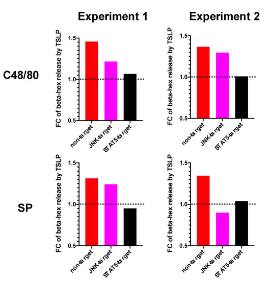 Exploiting our recently established Accell® mediated RNAi protocol [5,28,54], which also efficiently ablates STAT5- and JNK upon administration of siRNAs targeting these two components [44], we finally sought to validate the results from pharmacological inhibition with another technique. Interestingly, the STAT5-knockdown completely reversed the effect of TSLP, again moving the “with TSLP/without TSLP” ratio to 1, signifying no remaining effect of TSLP (Figure 6). This was found in both independent experiments and for the two MRGPRX2 agonists alike. Some involvement of JNK appeared likely, because the ratio was likewise (slightly or prominently) reduced in all four combinations, yet the effects were smaller. Taken together, the outcomes obtained with the two methods, i.e., inhibitors and RNAi, were perfectly in accord regarding both STAT5 and JNK.