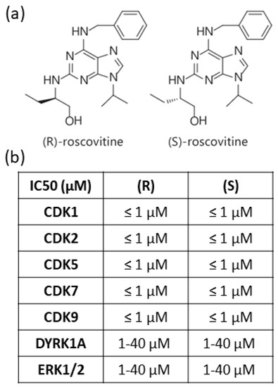 Roscovitine identification, one of the most popular inhibitors of CDKs, was born from the collaboration of Laurent Meijer’s group of the Biological Station in Roscoff and Jaroslav Vesely and Miroslav Strnad’s group at the Institute of Experimental Botany in Olomouc [54,55]. Roscovitine is a member of the family of 2,6,9-trisubstituted purines, as olomoucine and purvalanol. This family acts by direct competition with adenosine triphosphate (ATP) for binding to the catalytic cleft on CDK [54]. Roscovitine exists as two stereoisomers, (R)-roscovitine and (S)-roscovitine; however, the (R)-stereoisomer is the most frequently studied and used (Figure 1a). Roscovitine selectivity was tested on a wide panel of purified kinase. (R)-roscovitine half-maximal inhibitory concentration (IC50) values were below 1 μM for CDK1, CDK2, CDK5, CDK7, and CDK9 and IC50 values were in the 1–40 μM range for few other kinases including DYRK1A and extracellular signal-regulated kinases ERK1 and ERK2 (Figure 1b).