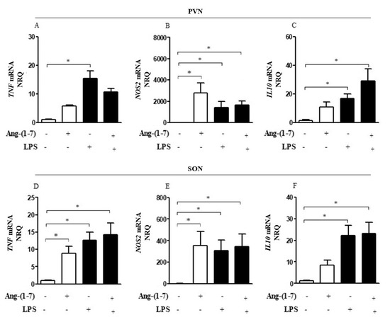 Neuroinflammatory analysis showed significant effects of LPS on TNF, NOS2, and IL10 gene expression in PVN (F = 54.09, p < 0.0001; F = 6.69, p = 0.8169; F = 14.39, p = 0.0008, respectively) and SON (F = 11.34, p = 0.0022; F = 2.11, p = 0.1582; F = 20.86, p < 0.0001, respectively) (Figure 1A–F). Central administration of Ang-(1-7) did not change the TNF, NOS2, and IL10 gene expression in the hypothalamic nuclei of endotoxemic rats, but there was a tendency to mitigate TNF and elevate IL10 gene expression in PVN (F = 0.1492, p = 0.7025; F = 4.181, p = 0.0515, respectively) (Figure 1A,C).