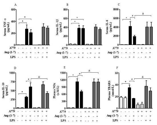 LPS significantly increased the production of inflammatory markers analyzed including serum and plasma levels of TNF-α, IL-1β, IL-6, IL-10, NOx, and TBARS as compared with the control group (F = 70.12, p < 0.0001; F = 171.70, p < 0.0001; F = 60.02, p < 0.0001; F = 181.60, p < 0.0001; F = 297.90, p < 0.0001; F = 33.99, p < 0.0001, respectively). Central administration of Ang-(1-7) specifically decreased IL-6, NOx, and TBARS, and increased serum IL-10 levels in endotoxemic rats (F = 1.47, p < 0.05; F = 2.88, p = 0.0429; F = 22.75, p < 0.0001; F = 4.99, p = 0.0044, respectively); however, administration of A779 abrogated these peripheral anti-inflammatory responses (Figure 2A–F). Statistical analysis showed significant endotoxemia and central administration of Ang-(1-7) interaction (F = 1.43, p < 0.05; F = 5.18, p = 0.0036; F = 3.08, p = 0.0339; F = 16.55, p < 0.0001) for IL-6, IL-10, NOx, and TBARS levels, respectively.