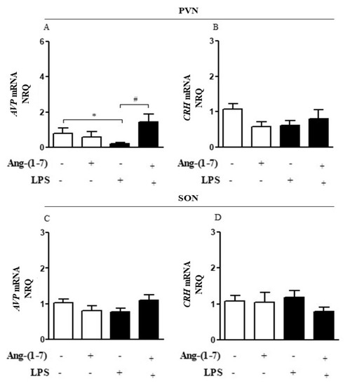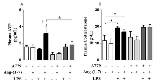 In addition, the increase in AVP mRNA induced by Ang-(1-7) did not potentiate the secretion of CRH, nor the plasma concentration of corticosterone in the rats in which LPS was administered. The use of A779 did not alter the plasma corticosterone level indicating that central Ang-(1-7) administration does not seem to participate in the activation of the HPA axis in our study. In accordance with our results, a recent study showed that ACE2 overexpression mice had no effect on plasma corticosterone under stress conditions [44]. Thus, our data suggest that other humoral pathways, such as AVP release, may mediate the anti-inflammatory induced by Ang-(1-7), in an experimental model of endotoxemia.