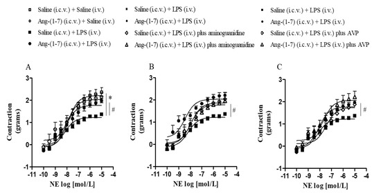 After 6 h of LPS administration, the thoracic aorta of each animal of experimental groups (Saline (i.c.v.) + Saline (i.c.v.) + Saline (i.v.) (control group); (2) Saline (i.c.v.) + Ang-(1-7) (i.c.v.) + Saline (i.v.); (3) Saline (i.c.v.) + Saline (i.c.v.) + LPS (i.v.); (4) Saline (i.c.v.) + Ang-(1-7) (i.c.v.) + LPS (i.v.)) was sectioned and cut into four rings of the same size (4 mm) to normalize contractile forces. The rings were kept in two stainless steel stirrups and connected to an isometric force transducer (Letica Scientific Instruments, Barcelona, Spain) in a chamber containing Krebs solution (composition in mmol/L: NaCl 130.0; KCl 4.7; KH2PO4 1.2; MgSO4 1.2; NaHCO3 14.9; C6H12O6 5.5; CaCl2 1.6), pH 7.4, supplied with a gas containing 95% O2 and 5% CO2 at 37 °C. Each ring was stretched to a resting tension of 1.5 g, which was maintained for 60 min for stabilization. In vitro, the rings were subsequently stimulated with phenylephrine (0.1 μmol/L), a selective α1-adrenergic receptor agonist, and the presence or absence of endothelium was verified using acetylcholine (1 μmol/L). Cumulative concentration-effect curves were constructed for norepinephrine (NE) (0.1 μmol/L–10 μmol/L) in the presence or absence of the aminoguanidine, NOS2 selective inhibitor (100 μmol/L), and AVP (1 nmol/L).