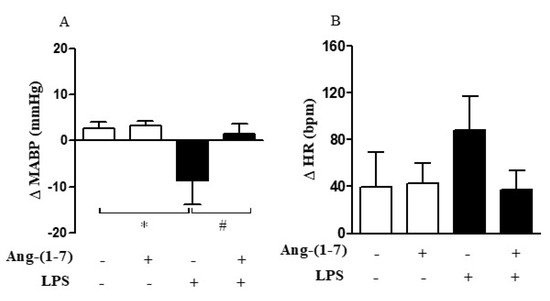 Central Ang-(1-7) prevented LPS-induced hypotension in endotoxemic rats. Effect of central Ang-(1-7) (0.3 nmol in 2 µL, i.c.v.) on mean arterial blood pressure (MABP) (A) and heart rate (HR) (B) in rats submitted to endotoxemia (LPS, 1.5 mg/Kg, i.v.) for a 6-h period. Data are expressed as the mean ± SEM, n = 6–9. ANOVA, followed by Bonferroni post-hoc test. * p < 0.05 versus Saline (i.c.v.) + Saline (i.v.) group, and # p < 0.05 versus Saline (i.c.v) + LPS (i.v.) group.