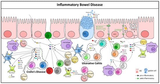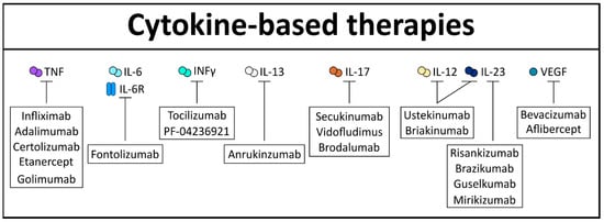 The etiology of inflammatory bowel diseases (IBDs) still remains unknown, but there has been mounting evidence that it is associated with an abnormal microflora, unregulated immune responses, genetic susceptibility, and lifestyle choices. IBD is broadly categorized into Crohn’s disease (CD) and ulcerative colitis (UC). In UC, inflammation is mostly confined to the colon, whereas in CD it can affect many parts of the gastrointestinal tract, often leading to strictures and fistulas. Extraintestinal manifestations, like joint pain, psoriasis, ankylosing spondylitis, or primary sclerosing cholangitis (PSC), are frequently diagnosed in both forms of IBD [16,86]. Genome-wide association studies (GWAS), mouse models of colitis, and in vitro organoid experiments from murine and human gut tissue have greatly advanced the understanding of the molecular mechanisms involved in cytokine signaling and immune–epithelial interactions and their impact on mucosal inflammation [87]. In the present scenario, it is clear that a perturbed cytokine cascade amplifies inflammation.