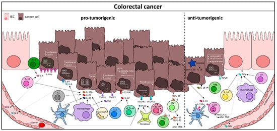 Colorectal cancer (CRC) is, like any other cancer, a complex disease with a high prevalence globally. Malignant epithelial cancer cells are supported by the tumor microenvironment, which includes various immune cells, cancer-associated fibroblasts, and circulating cytokines [120,121], many of which have been demonstrated to promote CRC progression [122]. Cytokines promoting tumorigenesis are IL-4, IL-6, IL-8, IL-11, IL-17A, IL-22, IL-23, IL-33, TNF-α, TGF-β, and VEGF (vascular endothelial growth factor), whereas cytokines with antitumorigenic properties are IFN-γ, IL-12, IL-15, IL-17F, and IL-18. The contribution of the cytokines IL-1, IL-9, IL-10, IL-21, and GM-CSF to CRC development and progression remains unclear [122].