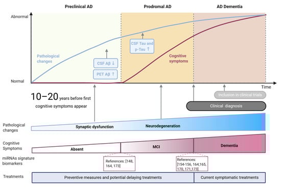 Main stages and features of Alzheimer’s disease. Pathological changes and cognitive symptoms are represented as blue and brown lines, respectively. Pathological hallmarks currently used as biomarkers (Aβ and tau) are shown in blue rectangles, while key global pathological changes are indicated with arrows. Cognitive symptoms are summarized as MCI (mild cognitive impairment) and dementia stages. miRNA-based signatures for potential diagnosis of MCI and AD stages are indicated as references.
