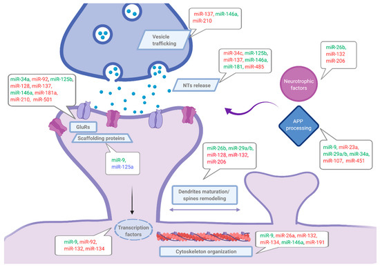 Otherwise, it is known that reactive astrocytes and inflammatory microglia are part of the pathological AD environment, although outside the scope of this review, it is interesting to point out that both cell populations produce and secrete extracellular vesicles (EVs) that are able to fuse with target cells to which they transfer their content (containing protein, lipids, and RNA species among which miRNAs are the most abundant type). This physiological communication channel between different cell types is known to be altered in pathological conditions [135]. In this regard, EVs secreted from reactive microglia were shown to be enriched in specific miRNAs, including miR-146a-5p that can be transferred to neurons, thereby downregulating neuronal synaptic targets such as synaptotagmin1 (Syt1) and neuroligin1 (Nlg1), negatively affecting dendritic spine density and excitatory synapses reduction [106]. Of interest, miR-26a, enriched in astrocyte-derived EVs, can be transferred to hippocampal neurons modulating their dendritic complexity [50].