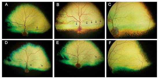 Other funduscopic lesions detected included the development of small dark-colored foci in the tapetal fundus of the majority of eyes of dogs older than 23 months (Figure 1D–F). Pinpoint hyper-reflective foci scatted across the tapetal fundus developed in three dogs in the older age groups (out of four dogs). Both eyes of two of the three dogs older than 60 months of age had mild attenuation of the superficial retinal vasculature.