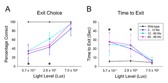 Vision testing results in Rpe65-deficient dogs. (A). The mean correct exit choices (± SD) for the wild-type and three age groups of Rpe65-deficient dogs. At full room light (~750 lux), there was no significant difference in correct exit choices. For the intermediate and low light levels (~2.8 and ~0.057 lux), the Rpe65-deficient dogs made significantly more errors in tunnel choice than the control dogs. There were no significant differences in correct exit choices between the three age groups of Rpe65-deficient dogs at any of the light intensities. (B). The mean time to exit the vision testing apparatus (± SD). The Rpe65-deficient dogs in all age groups exited the device rapidly and in a similar time to the control dogs. At the lower two lighting levels, they took significantly longer to exit the device than the wild-type controls. There were no significant differences in time to exit between any of the three age groups of Rpe65-deficient dogs at any light intensity. Dogs are grouped as follows: wild-type dogs 6–14 months, n = 10 eyes; Rpe65-deficient dogs 3–12 months, n = 24 eyes; 12–60 months, n = 24 eyes, and 60–96 months, n = 8 eyes. * p < 0.05.