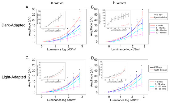 Mean (± SD) ERG amplitude stimulus–response plots in dark- and light-adapted eyes. In each instance, the insert compares the mean wild-type amplitudes of wild-type controls with the 2–3-month-old Rpe65-deficient dogs (note difference in response threshold between wild-type and Rpe65-deficient dogs). (A,B) Dark-adapted and (C,D) light-adapted mean a-wave (A,C) and b-wave (B,D). Note that amplitudes reduce significantly with age (* indicates flash stimuli with a significant change in amplitude [p < 0.05] with age) <3 months, n = 8 eyes; 3–12 months, n = 34 eyes; 12–60 months, n = 28 eyes; 60–96 months, n = 8 eyes. Wild-type control dogs: 9–12 months, n = 10 eyes.