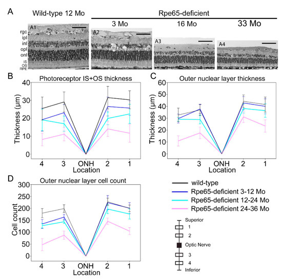 Detailed assessment of retinal layers on plastic-embedded sections was performed on three groups of younger Rpe65-deficient dogs (3–12, 12–24 and 24–36 months of age) and compared with wild-type dogs within this age range to allow detection of early changes in retinal layer thicknesses. Measurements of retinal layer thicknesses at four sites vertically through the optic nerve head showed that there was a progressive thinning of the retina over this age range (Figure 6 and Figure S1). The thinning was more severe and occurred earlier in the inferior retinal regions, with the outer retinal layers being more severely affected (Figure 6B–D and Figure S1). Over the age range assessed, there was significant thinning of all layers (p = 0.02 to 0.001) except the combined nerve fiber/ganglion cell layer (Figure 6B,C and Figure S1). The most notable changes were thinning of the combined inner and outer segment layer (reduced length of inner plus outer segments) (Figure 6B) and thinning of the outer nuclear layer (Figure 6C). This was accompanied by a reduced number of photoreceptor nuclei per unit length (p = 0.004) (Figure 6D).