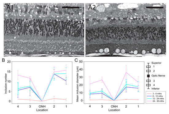 The RPE layer increased in thickness with age (p = 0.01) (Figure S1) in the Rpe65-deficient dogs and this appeared to be largely due to the development of RPE inclusions (Figure 7), which were absent in the wild-type controls. The RPE inclusions were sparsely present at 3–6 months (1.0 ± 1.0 inclusions per 200 µm), increasing in number to 13.8 ± 2.6 inclusions per 200 µm at 24–36 months (Figure 7B). A similar increase in the size of inclusions was appreciated as the animals got older, from a mean of 1.0 ± 0.5 µm in cross-sectional diameter at 3–6 months to 27 ± 7 µm at 24–36 months of age (Figure 7C).