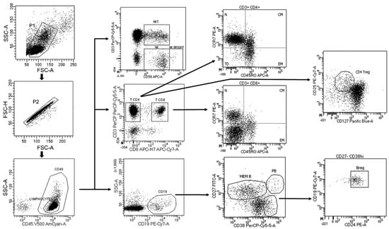 A gate including lymphocytes and monocytes and excluding debris and apoptotic cells was first established (Figure 1). CD4+ and CD8+ T cells were classified as: central memory (CM) (CCR7+ CD45RO+), naïve (CCR7+ CD45RO-), terminally differentiated (TD) (CCR7- CD45RO-) and effector memory (EM) (CCR7- CD45RO+). Regulatory CD4 T cells (Treg) were defined as CD3+ CD4+ CD25hi CD127low. B cells were classified as: plasmablasts (CD19+ CD27hi CD38hi), memory (CD19+ CD27dim CD38dim) and regulatory B cells (Breg) (CD19+ CD27- CD24hi CD38hi). Monocytes were also studied, and their subsets were classified according to the expression of CD14 and CD16 (Mo1: CD14++ CD16-; Mo2: CD14++ CD16+; Mo3: CD14+ CD16+). Dendritic cells (DCs) were differentiated into myeloid DCs (mDC: CD14- CD11c+) and plasmacytoid DCs (pDC: HLA-DR+ CD123+). Natural killer (NK) cells (CD56dim CD3-), natural killer T (NKT) cells (CD56dim CD3+) and CD56bright NK cells (CD3- CD56bright) were also studied. Data analysis was performed using FACSDiva Software V.8.0 (BD Biosciences).