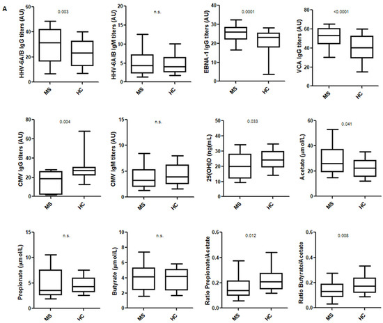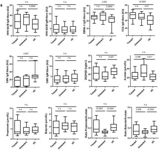 (A) Comparisons of the titers of the IgG and IgM viral antibodies, the levels of 25(OH)D, the levels of the three SCFA and PA/AA and BA/AA ratios between MS patients and HC. (B) MS patients were divided into those who were receiving treatment and those who were not at the time of sample collection. The upper line shows the comparison between treated MS patients and HC, the lower left line shows the comparison between treated and untreated MS patients and the lower right line shows the comparison between untreated MS patients and HC. Significant differences with the two-tailed t-test are shown (n.s.: not significant). Line inside the box shows the median value.