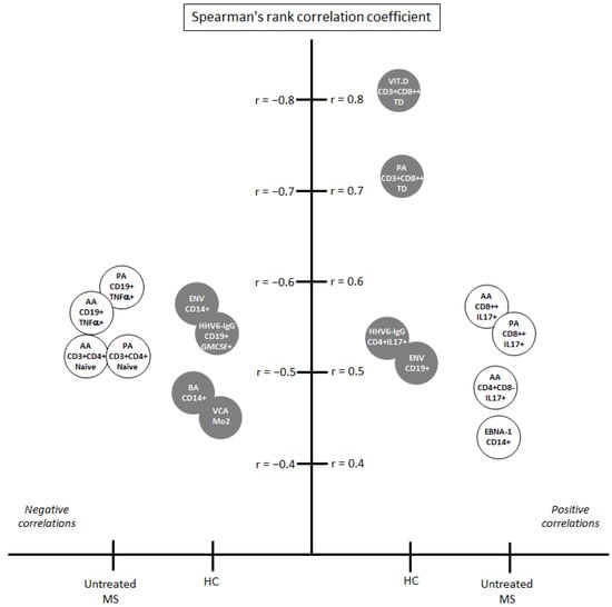 Main correlations among environmental factors and cell subsets: only those with p < 0.01 (Mann–Whitney U-test) and Spearman’s rank correlation coefficient (r) above 0.4 or below −0.4 are shown. Gray circles: correlations in HC group; white circles: correlations in MS group.