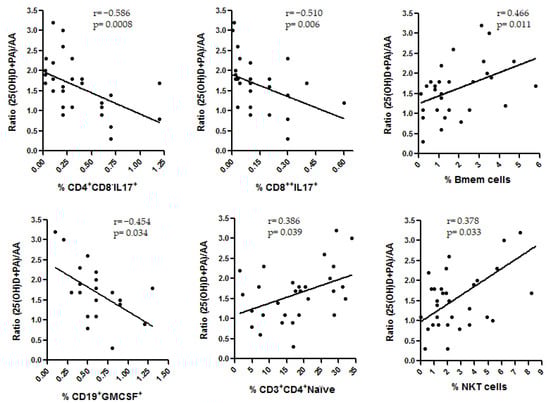 Significant correlations among (25(OH)D+PA)/AA algorithm and the cell subsets analyzed in untreated MS patients; p-values (Mann–Whitney U-test) and Spearman’s rank correlation coefficient (r) are shown.
