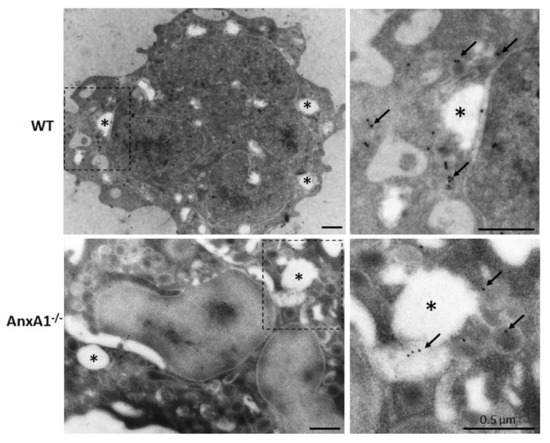 Expression of NLRP3 in WT and AnxA1-/- nigericin-stimulated neutrophils. Immunogold labeling of NLRP3 (arrows) was detected in the cytoplasm of the neutrophils from both genotypes. These cells also contained cytoplasmic vacuoles (asterisks) that characterize their activation by nigericin. Images on the right side show details of the highlighted areas of the respective images on the left side. Representative images of three experiments performed.