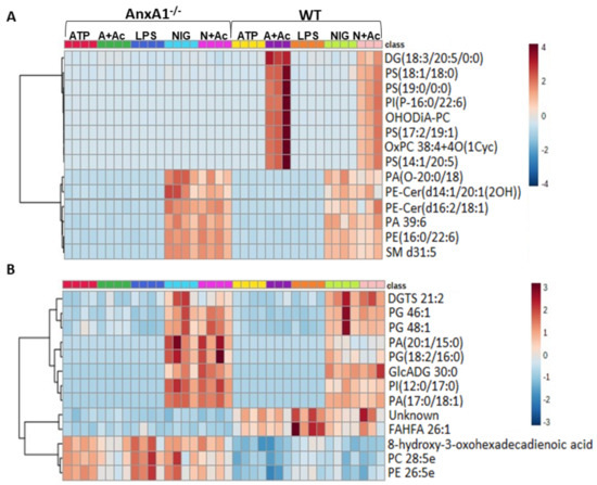 Lipidomic analysis of WT and AnxA1-/- neutrophils supernatants. Heatmaps with dendrograms show the hierarchical clustering of potential lipid biomarkers. (A) Positive mode. (B) Negative mode. The right bar in (A,B) represents the blue-red code (−4 to 4 for positive and −3 to 3 for negative mode) of the lipid normalized peak areas. WT and AnxA1-/- neutrophils were primed with lipopolysaccharide (LPS) and then stimulated with ATP, ATP with Ac2-26 pre-treatment (A + Ac), nigericin (NIG), and nigericin with Ac2-26 pre-treatment (N + Ac). Table S1 (Supplementary Material) shows the relevant chemical and statistical information for the discriminant lipids. Data are representative of one experiment performed.