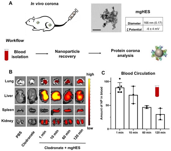 Monitoring the biodistribution and blood circulation of magnetic HES nanoparticles in vivo. (A) Magnetic HES nanoparticles (mgHES) were injected into mice and the blood was isolated after distinct time points (1 min–2 h). Nanoparticles were recovered from the blood via magnetic separation and further the protein corona surrounding nanoparticles after in vivo circulation was analysed. (B) A representative IVIS image of the different organs after treatment with PBS and clodronate-liposomes as control or mgHES nanoparticles. (C) The nanoparticle concentration in blood after distinct time points was measured via a Tecan Plate Reader and normalized based on the initial injected amount of nanoparticles (n = 2–6).