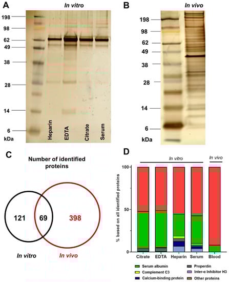Already by SDS-PAGE (Figure 2A,B), we observed a radical different protein pattern for the in vivo corona (1 min of blood circulation, Figure 2B) compared to the in vitro coronas (1 min incubation, Figure 2A). For the in vivo corona, a broad unspecific protein pattern was observed, whereas the in vitro pattern is less complex and there are only 3–5 major protein bands. In a next step, we identified all corona proteins by LC-MS. From the absolute amount of detected corona proteins, we already saw that the in vitro and in vivo corona share only a minor number of proteins and the overall amount of in vivo corona proteins is significantly higher (Figure 2C).